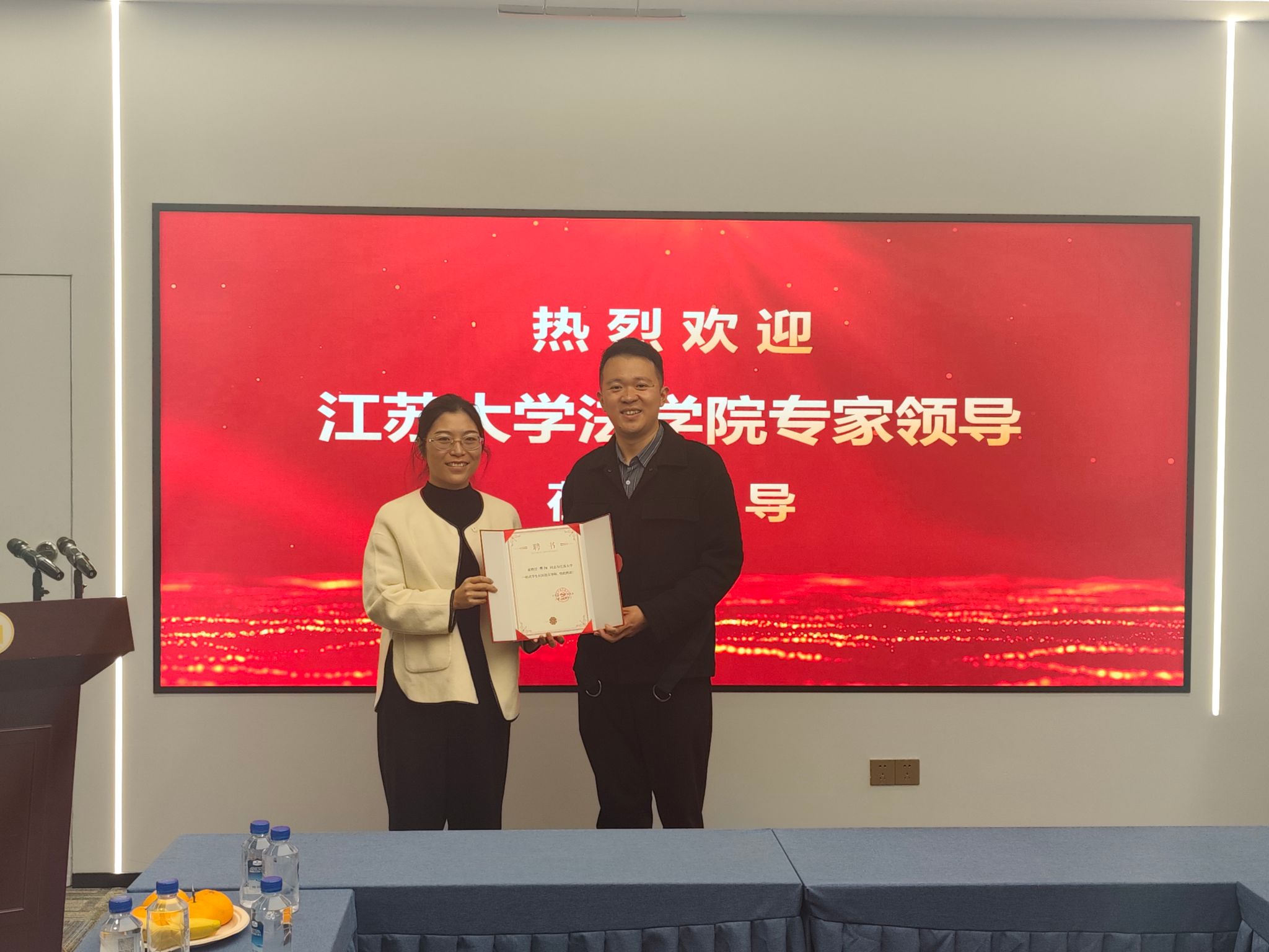施佳为江苏唯瑞尚一律师事务所主任朱亮、江苏唯瑞尚一律师事务所执行主任缪阳颁发江苏大学“一站式”学生社区校友导师聘书。